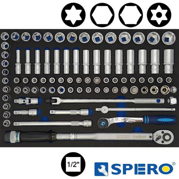 Foam module met een 84 delige 1/2'' doppenset. De gereedschappen liggen iets ruim in het foam wat uitname eenvoudig maakt. De buitenmaat van de module is 569x397mm.