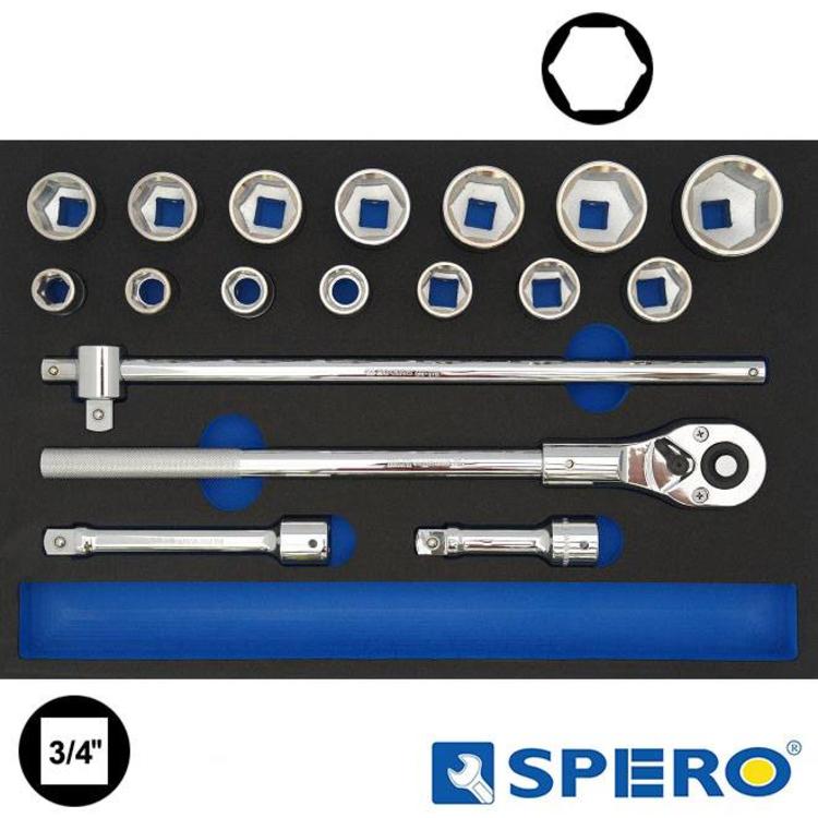 Foam module met een 18 delige 3/4'' doppenset. De gereedschappen liggen iets ruim in het foam wat uitname eenvoudig maakt. De buitenmaat van de module is 569x397mm.