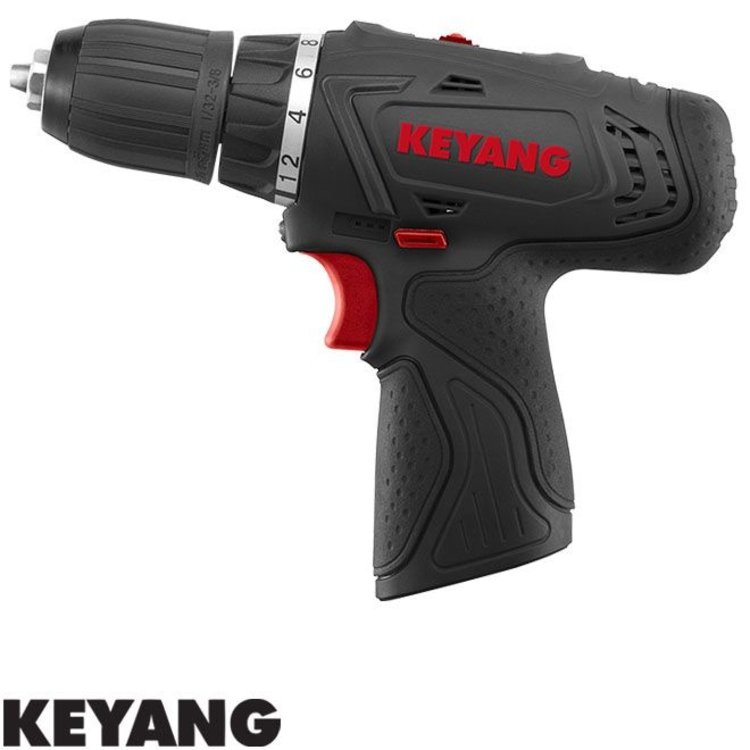 Keyang DD1202L2 accu boor-schroefmachine / boormachine geschikt voor boor en schroefwerkzaamheden. Zeer compacte en handzame machine met een gewicht van slechts 1.0 kg. Voorzien van 2 versnellingen, 18 momentinstellingen, slipkoppeling met LOCK, ledverlichting en accuspanningsindicator.