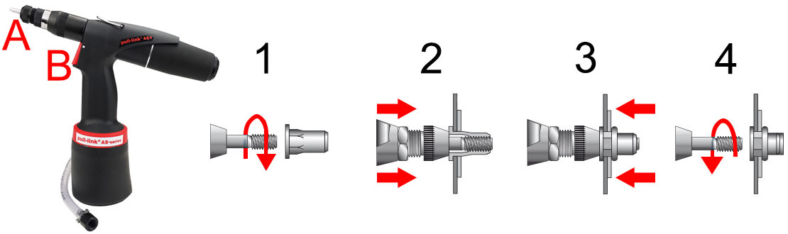 De Pull Link AS-4 blindklinkmoertang is een op slag gestuurde machine en is geschikt voor plaatsing van blindklinkmoeren in materialen met een constante materiaaldikte. Dit komt doordat de tang een blindklinkmoer klemt tussen het materiaal met een ingestelde werkslag. Uiteraard kan er met diverse materiaaldiktes worden gewerkt, maar dan dient de tang bij elke plaatdikte juist te worden ingesteld.