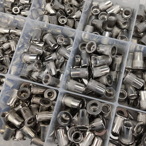 Complete set blindklinkmoeren 660 delig bestaande uit M4, M5, M6, M8 en M10. Kopvormen: cilindrische kop, verzonken kop en gereduceerd verzonken kop. Er zijn 3 sets leverbaar van de volgende materialen: staal, aluminium en RVS A2. Een handige complete set voor diverse toepassingen zoals voor de servicemonteur die op locatie een compleet assortiment blindklinkmoeren nodig heeft.