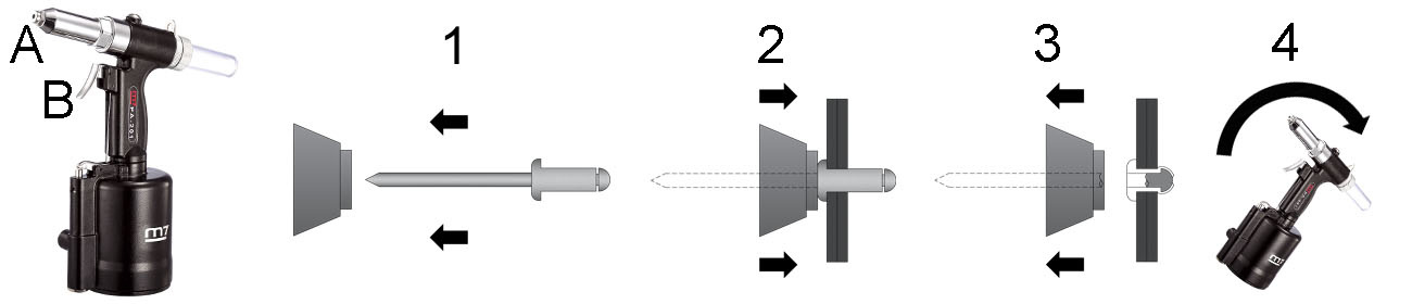 Capaciteit: 2.4mm; 3.0mm; 3.2mm; 4.0mm en 4.8mm van staal, aluminium en RVS. - Mighty Seven PA201 pneumatische popnageltang.
