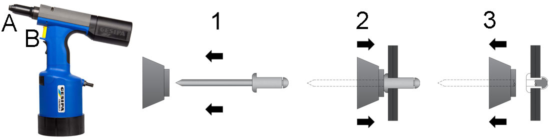 De blindklinknagel wordt aangetrokken en de trekpen breekt af, de trekpen wordt automatisch afgezogen naar het reservoir.