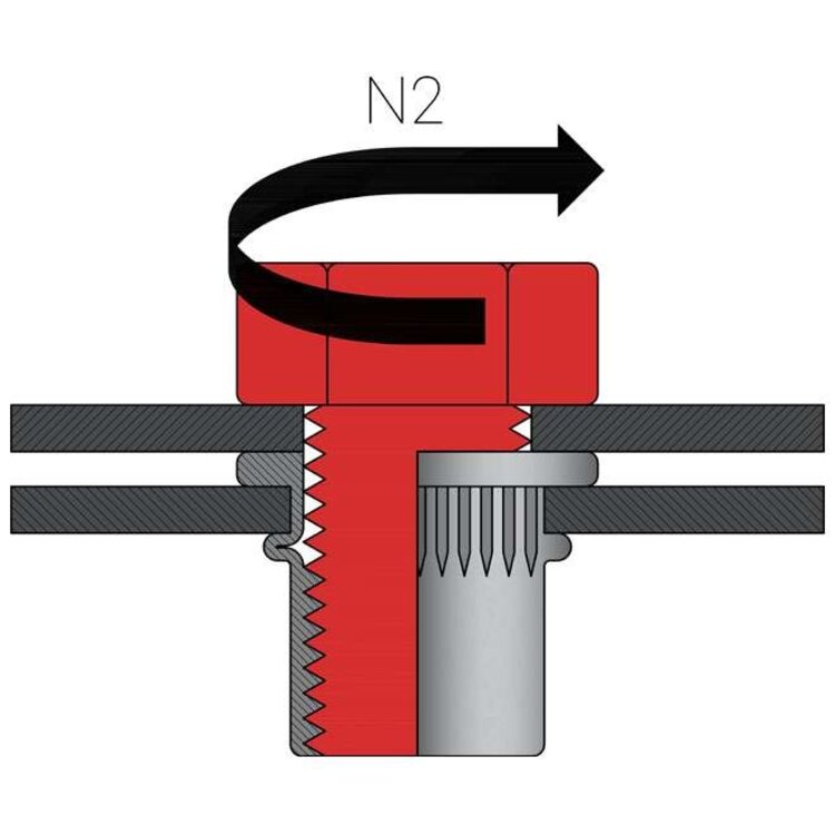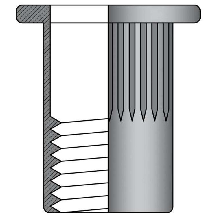 Stalen blindklinkmoeren M3 met cilindrische kop en gekartelde schacht. Dit type blindklinkmoer wordt over het algemeen gebruikt bij situaties waarbij de kop uit mag steken boven het werkstuk. De gekartelde schacht zorgt ervoor dat de blindklinkmoer zich vasttrekt in het materiaal, wat meedraaien voorkomt. Met een blindklinkmoer brengt u eenvoudig schroefdraad aan in plaatwerk, kokerprofielen en buisprofielen. Blindklinkmoeren kunnen worden geplaatst met een accu blindklinkmoertang, pneumatische blindklinkmoertang of een handmatige blindklinkmoertang. Bij het selecteren van de juiste blindklinkmoer moet de plaatdikte of wandikte worden opgemeten van het werkstuk. De gemeten dikte moet binnen het klembereik vallen van de blindklinkmoer.