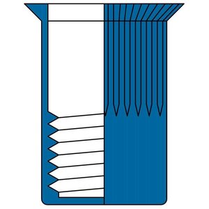 Stalen blindklinkmoeren M4 gesloten met verzonken kop en gekartelde schacht. Dit type blindklinkmoer wordt over het algemeen gebruikt bij situaties waarbij de kop niet mag uitsteken boven het werkstuk. Door het gat waar de blindklinkmoer in geplaatst wordt te verzinken met een 90-graden verzinkboor valt de kop van de blindklinkmoer weg en steekt het niet uit. De gekartelde schacht zorgt ervoor dat de blindklinkmoer zich vasttrekt in het materiaal, wat meedraaien voorkomt. Met een blindklinkmoer brengt u eenvoudig schroefdraad aan in plaatwerk, kokerprofielen en buisprofielen. Blindklinkmoeren kunnen worden geplaatst met een accu blindklinkmoertang, pneumatische blindklinkmoertang of een handmatige blindklinkmoertang. Bij het selecteren van de juiste blindklinkmoer moet de plaatdikte of wandikte worden opgemeten van het werkstuk. De gemeten dikte moet binnen het klembereik vallen van de blindklinkmoer.