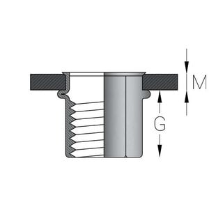 Stalen blindklinkmoeren M4 zeskant met gereduceerd verzonken kop. Dit type blindklinkmoer wordt over het algemeen gebruikt bij situaties waarbij de kop niet mag uitsteken boven het werkstuk. Bij juiste plaatsing steekt de kop van de blindklinkmoer nagenoeg niet uit boven het materiaal. De zeskant schacht zorgt ervoor dat de blindklinkmoer niet kan meedraaien in het materiaal. Met een blindklinkmoer brengt u eenvoudig schroefdraad aan in plaatwerk, kokerprofielen en buisprofielen. Blindklinkmoeren kunnen worden geplaatst met een accu blindklinkmoertang, pneumatische blindklinkmoertang of een handmatige blindklinkmoertang. Bij het selecteren van de juiste blindklinkmoer moet de plaatdikte of wandikte worden opgemeten van het werkstuk. De gemeten dikte moet binnen het klembereik vallen van de blindklinkmoer.