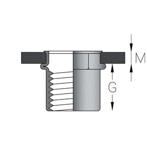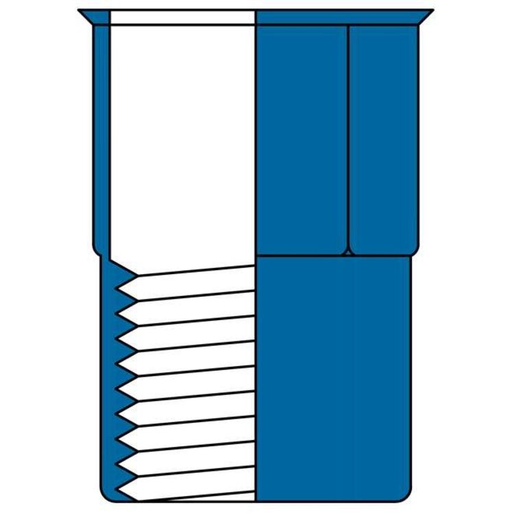 Stalen blindklinkmoeren M5 half zeskant met gereduceerd verzonken kop. Dit type blindklinkmoer wordt over het algemeen gebruikt bij situaties waarbij de kop niet mag uitsteken boven het werkstuk. Bij juiste plaatsing steekt de kop van de blindklinkmoer nagenoeg niet uit boven het materiaal. De zeskant schacht zorgt ervoor dat de blindklinkmoer niet kan meedraaien in het materiaal. Met een blindklinkmoer brengt u eenvoudig schroefdraad aan in plaatwerk, kokerprofielen en buisprofielen. Blindklinkmoeren kunnen worden geplaatst met een accu blindklinkmoertang, pneumatische blindklinkmoertang of een handmatige blindklinkmoertang. Bij het selecteren van de juiste blindklinkmoer moet de plaatdikte of wandikte worden opgemeten van het werkstuk. De gemeten dikte moet binnen het klembereik vallen van de blindklinkmoer.