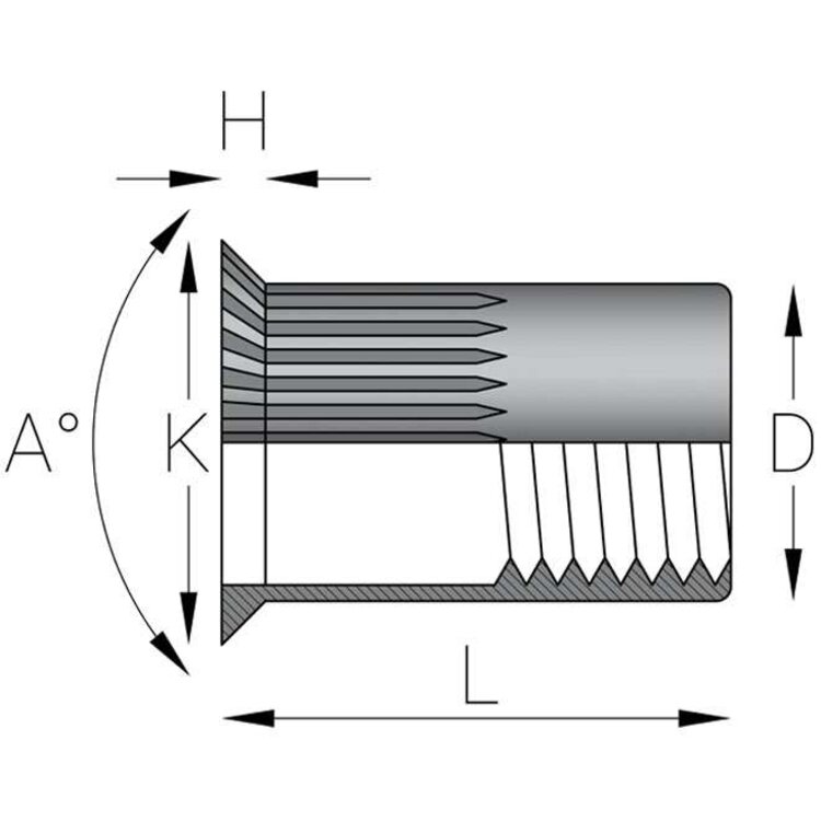 Aluminium blindklinkmoeren M6 met verzonken kop en gekartelde schacht. Dit type blindklinkmoer wordt over het algemeen gebruikt bij situaties waarbij de kop niet mag uitsteken boven het werkstuk. Door het gat waar de blindklinkmoer in geplaatst wordt te verzinken met een 90-graden verzinkboor valt de kop van de blindklinkmoer weg en steekt het niet uit. De gekartelde schacht zorgt ervoor dat de blindklinkmoer zich vasttrekt in het materiaal, wat meedraaien voorkomt. Met een blindklinkmoer brengt u eenvoudig schroefdraad aan in plaatwerk, kokerprofielen en buisprofielen. Blindklinkmoeren kunnen worden geplaatst met een accu blindklinkmoertang, pneumatische blindklinkmoertang of een handmatige blindklinkmoertang. Bij het selecteren van de juiste blindklinkmoer moet de plaatdikte of wandikte worden opgemeten van het werkstuk. De gemeten dikte moet binnen het klembereik vallen van de blindklinkmoer.