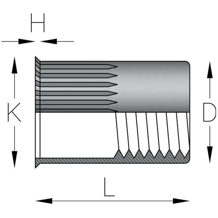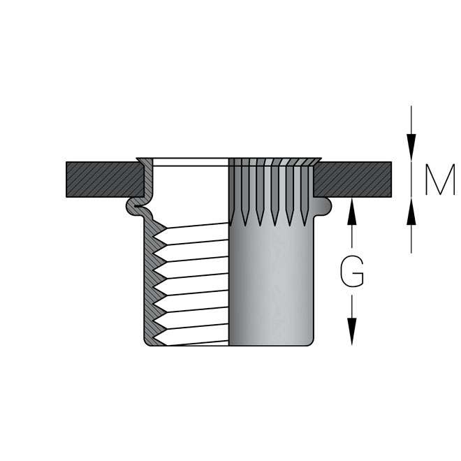 Stalen blindklinkmoeren M6 met gereduceerd verzonken kop en gekartelde schacht. Dit type blindklinkmoer wordt over het algemeen gebruikt bij situaties waarbij de kop niet mag uitsteken boven het werkstuk. Bij juiste plaatsing steekt de kop van de blindklinkmoer nagenoeg niet uit boven het materiaal. De gekartelde schacht zorgt ervoor dat de blindklinkmoer zich vasttrekt in het materiaal, wat meedraaien voorkomt. Met een blindklinkmoer brengt u eenvoudig schroefdraad aan in plaatwerk, kokerprofielen en buisprofielen. Blindklinkmoeren kunnen worden geplaatst met een accu blindklinkmoertang, pneumatische blindklinkmoertang of een handmatige blindklinkmoertang. Bij het selecteren van de juiste blindklinkmoer moet de plaatdikte of wandikte worden opgemeten van het werkstuk. De gemeten dikte moet binnen het klembereik vallen van de blindklinkmoer.