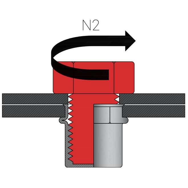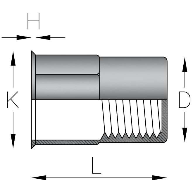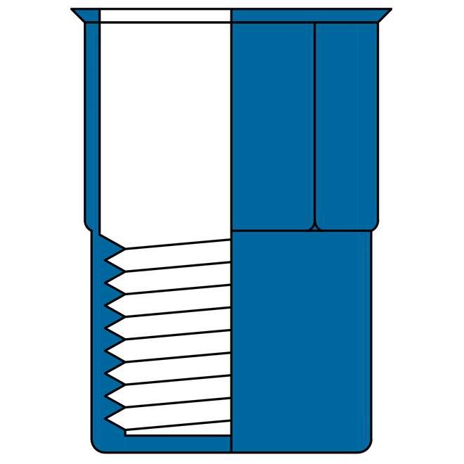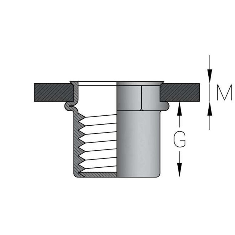 Stalen blindklinkmoeren M6 gesloten half zeskant met gereduceerd verzonken kop. Dit type blindklinkmoer wordt over het algemeen gebruikt bij situaties waarbij de kop niet mag uitsteken boven het werkstuk. Bij juiste plaatsing steekt de kop van de blindklinkmoer nagenoeg niet uit boven het materiaal. De zeskant schacht zorgt ervoor dat de blindklinkmoer niet kan meedraaien in het materiaal. Met een blindklinkmoer brengt u eenvoudig schroefdraad aan in plaatwerk, kokerprofielen en buisprofielen. Blindklinkmoeren kunnen worden geplaatst met een accu blindklinkmoertang, pneumatische blindklinkmoertang of een handmatige blindklinkmoertang. Bij het selecteren van de juiste blindklinkmoer moet de plaatdikte of wandikte worden opgemeten van het werkstuk. De gemeten dikte moet binnen het klembereik vallen van de blindklinkmoer.