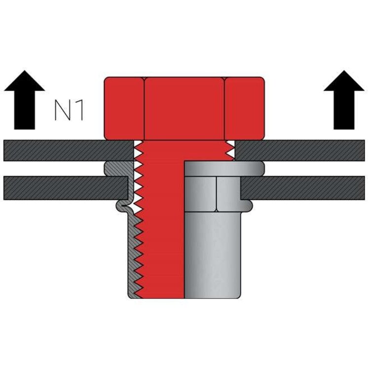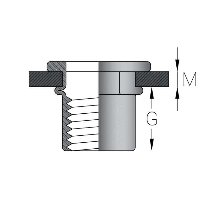 Stalen blindklinkmoeren M6 half zeskant met cilindrische kop. Dit type blindklinkmoer wordt over het algemeen gebruikt bij situaties waarbij de kop uit mag steken boven het werkstuk. De zeskant schacht zorgt ervoor dat de blindklinkmoer niet kan meedraaien in het materiaal. Met een blindklinkmoer brengt u eenvoudig schroefdraad aan in plaatwerk, kokerprofielen en buisprofielen. Blindklinkmoeren kunnen worden geplaatst met een accu blindklinkmoertang, pneumatische blindklinkmoertang of een handmatige blindklinkmoertang. Bij het selecteren van de juiste blindklinkmoer moet de plaatdikte of wandikte worden opgemeten van het werkstuk. De gemeten dikte moet binnen het klembereik vallen van de blindklinkmoer.