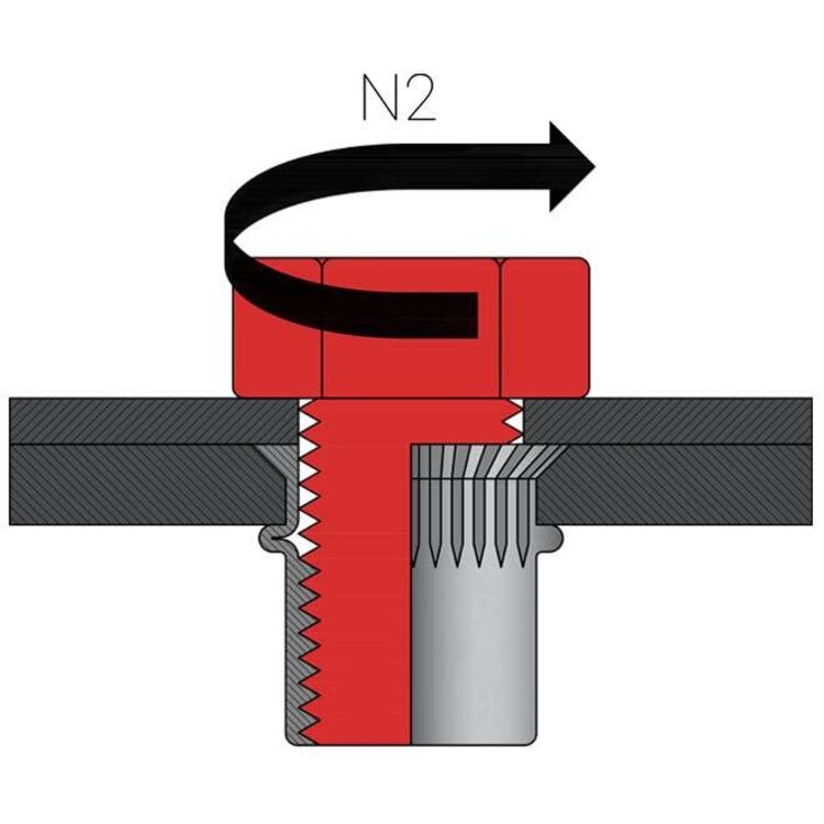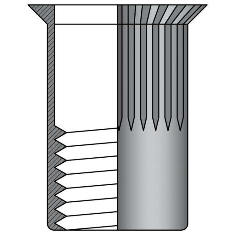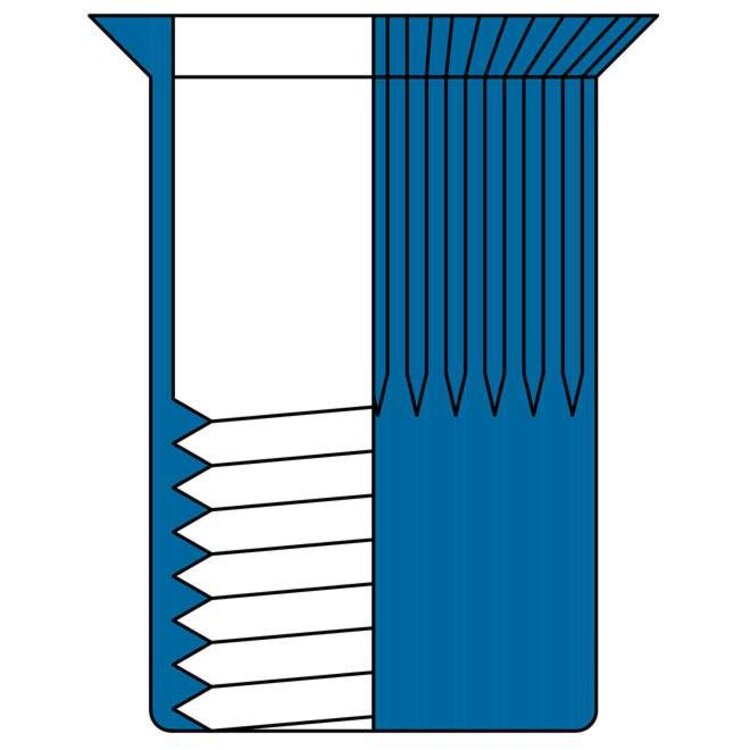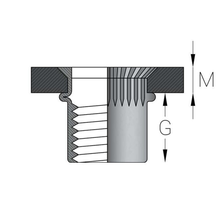 Stalen blindklinkmoeren M6 met verzonken kop en gekartelde schacht. Dit type blindklinkmoer wordt over het algemeen gebruikt bij situaties waarbij de kop niet mag uitsteken boven het werkstuk. Door het gat waar de blindklinkmoer in geplaatst wordt te verzinken met een 90-graden verzinkboor valt de kop van de blindklinkmoer weg en steekt het niet uit. De gekartelde schacht zorgt ervoor dat de blindklinkmoer zich vasttrekt in het materiaal, wat meedraaien voorkomt. Met een blindklinkmoer brengt u eenvoudig schroefdraad aan in plaatwerk, kokerprofielen en buisprofielen. Blindklinkmoeren kunnen worden geplaatst met een accu blindklinkmoertang, pneumatische blindklinkmoertang of een handmatige blindklinkmoertang. Bij het selecteren van de juiste blindklinkmoer moet de plaatdikte of wandikte worden opgemeten van het werkstuk. De gemeten dikte moet binnen het klembereik vallen van de blindklinkmoer.