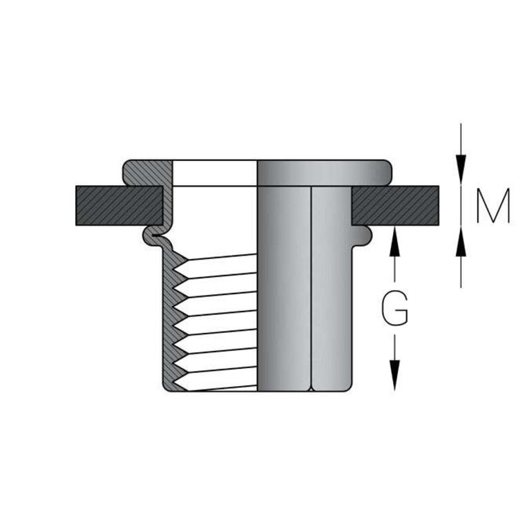 Stalen blindklinkmoeren M6 zeskant met cilindrische kop. Dit type blindklinkmoer wordt over het algemeen gebruikt bij situaties waarbij de kop uit mag steken boven het werkstuk. De zeskant schacht zorgt ervoor dat de blindklinkmoer niet kan meedraaien in het materiaal. Met een blindklinkmoer brengt u eenvoudig schroefdraad aan in plaatwerk, kokerprofielen en buisprofielen. Blindklinkmoeren kunnen worden geplaatst met een accu blindklinkmoertang, pneumatische blindklinkmoertang of een handmatige blindklinkmoertang. Bij het selecteren van de juiste blindklinkmoer moet de plaatdikte of wandikte worden opgemeten van het werkstuk. De gemeten dikte moet binnen het klembereik vallen van de blindklinkmoer.