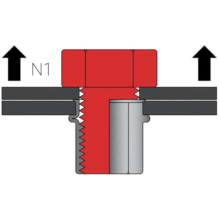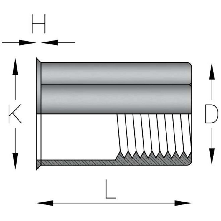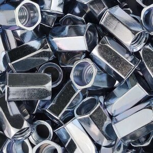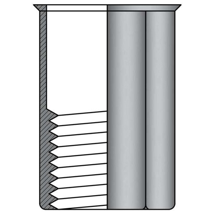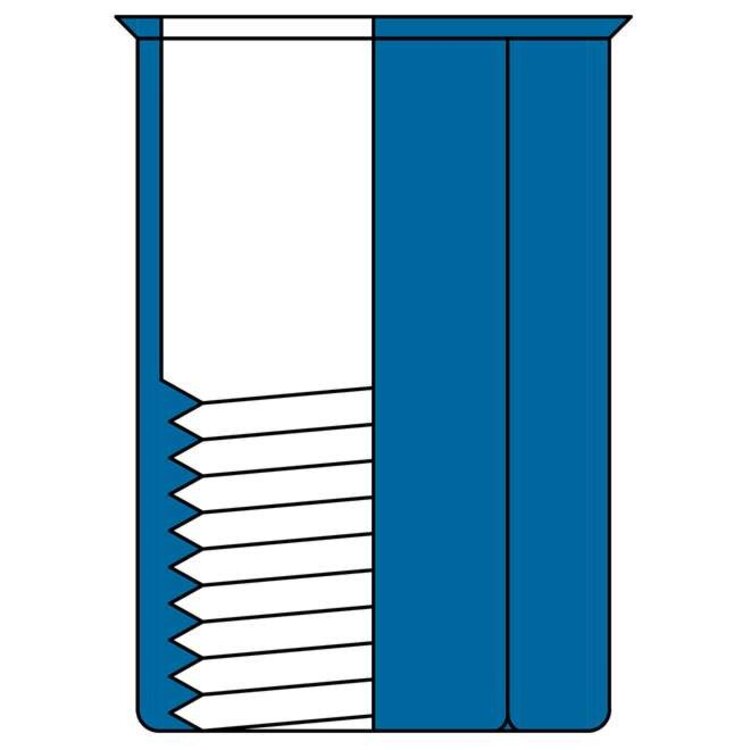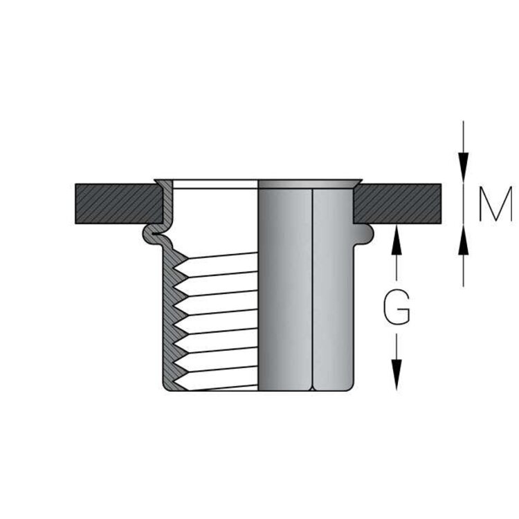 Stalen blindklinkmoeren M6 zeskant met gereduceerd verzonken kop. Dit type blindklinkmoer wordt over het algemeen gebruikt bij situaties waarbij de kop niet mag uitsteken boven het werkstuk. Bij juiste plaatsing steekt de kop van de blindklinkmoer nagenoeg niet uit boven het materiaal. De zeskant schacht zorgt ervoor dat de blindklinkmoer niet kan meedraaien in het materiaal. Met een blindklinkmoer brengt u eenvoudig schroefdraad aan in plaatwerk, kokerprofielen en buisprofielen. Blindklinkmoeren kunnen worden geplaatst met een accu blindklinkmoertang, pneumatische blindklinkmoertang of een handmatige blindklinkmoertang. Bij het selecteren van de juiste blindklinkmoer moet de plaatdikte of wandikte worden opgemeten van het werkstuk. De gemeten dikte moet binnen het klembereik vallen van de blindklinkmoer.