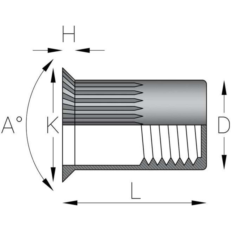 RVS A2 blindklinkmoeren M8 gesloten met verzonken kop en gekartelde schacht. Dit type blindklinkmoer wordt over het algemeen gebruikt bij situaties waarbij de kop niet mag uitsteken boven het werkstuk. Door het gat waar de blindklinkmoer in geplaatst wordt te verzinken met een 90-graden verzinkboor valt de kop van de blindklinkmoer weg en steekt het niet uit. De gekartelde schacht zorgt ervoor dat de blindklinkmoer zich vasttrekt in het materiaal, wat meedraaien voorkomt. Met een blindklinkmoer brengt u eenvoudig schroefdraad aan in plaatwerk, kokerprofielen en buisprofielen. Blindklinkmoeren kunnen worden geplaatst met een accu blindklinkmoertang, pneumatische blindklinkmoertang of een handmatige blindklinkmoertang. Bij het selecteren van de juiste blindklinkmoer moet de plaatdikte of wandikte worden opgemeten van het werkstuk. De gemeten dikte moet binnen het klembereik vallen van de blindklinkmoer.