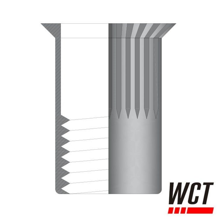 Blindklinkmoeren M4 staal met verzonken kop en gekartelde schacht. Deze blindklinkmoer wordt over het algemeen gebruikt bij situaties waarbij de kop niet mag uitsteken buiten het werkstuk. Door het gat waar de blindklinkmoer in geplaatst wordt te verzinken met een 90-graden verzinkboor valt de kop van de blindklinkmoer weg en steekt het niet uit. De gekartelde schacht zorgt ervoor dat de blindklinkmoer zicht vasttrekt in het materiaal, wat meedraaien voorkomt. Met een blindklinkmoer brengt u eenvoudig schroefdraad aan in dunne plaat, kokerprofielen en buisprofielen.