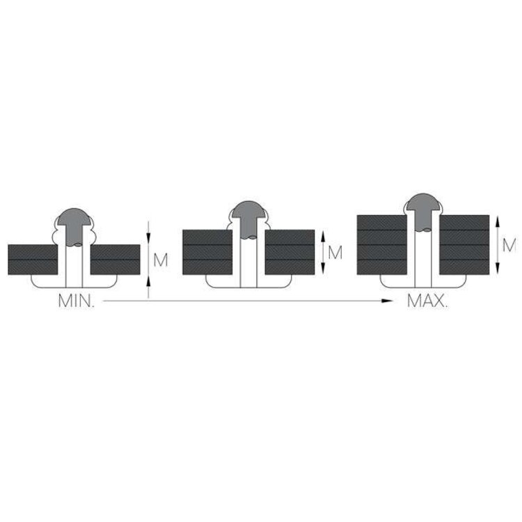 Multigrip popnagel 4.8 x 15.0mm met grote bolkop en een klembereik van 4.8 - 10.0mm. De body is gemaakt van aluminium en de trekpen van RVS A2. Multigrip popnagels worden gebruikt om zowel harde en zachte materialen aan elkaar te verbinden. De kop van de trekpen wordt mechanisch geborgd in de grote bolling achter het materiaal als de popnagel geplaatst is. Dit zorgt voor een goede drukverspreiding. Multigrip popnagels hebben een groter klembereik dan standaard popnagels. Blindklinknagels kunnen worden geplaatst met een accu popnageltang, pneumatische popnageltang of een handmatige popnageltang.