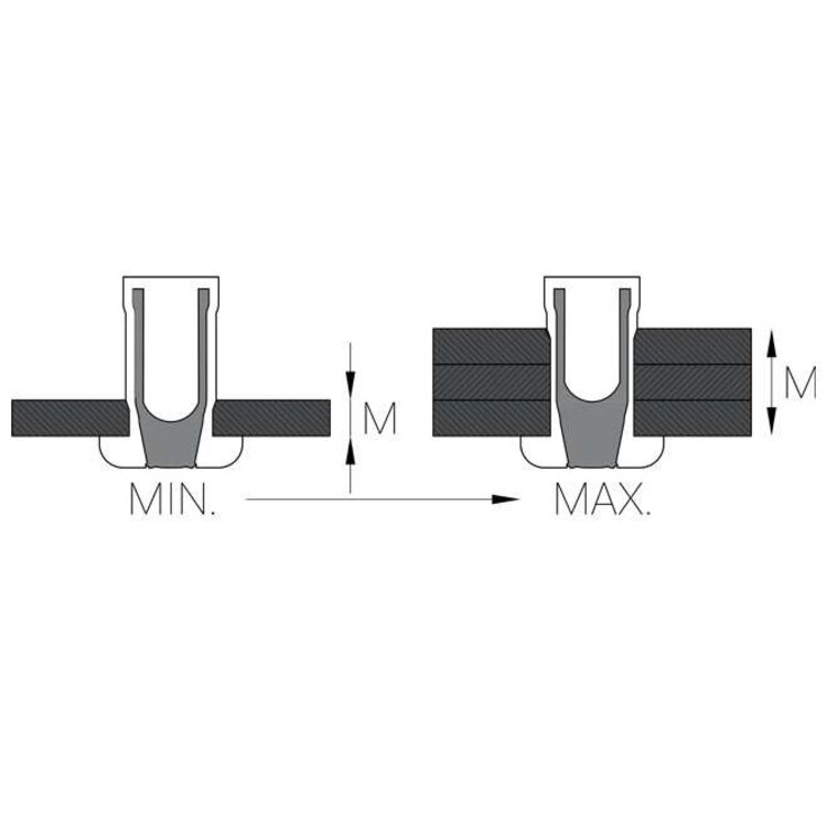Structurele popnagel 6.4 x 14.0mm met bolkop en een klembereik van 2.1 - 9.5mm. De body en trekpen zijn gemaakt van staal. Structurele popnagels van het type M worden gebruikt om bijvoorbeeld plaatmaterialen aan elkaar te bevestigen in de zwaardere industrie zoals bijvoorbeeld carrosseriebouw en voertuigbouw. Een structurele popnagel van het type M is steviger dan een standaard popnagel. De trekpen blijft mechanisch geborgd in de body. Hierdoor ontstaat een grote vibratieresistentie en een spatwaterdichte verbinding. Juiste plaatsing van de popnagel kan visueel gecontroleerd worden. LET OP! bij plaatsing van structurele popnagels van het type M is een speciaal neusstuk nodig. Blindklinknagels kunnen worden geplaatst met een accu popnageltang, pneumatische popnageltang of een handmatige popnageltang.