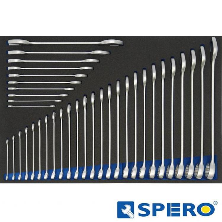 Foam module met een 36 delige ring-steeksleutelset. De gereedschappen liggen iets ruim in het foam wat uitname eenvoudig maakt. De buitenmaat van de module is 569x397mm.
