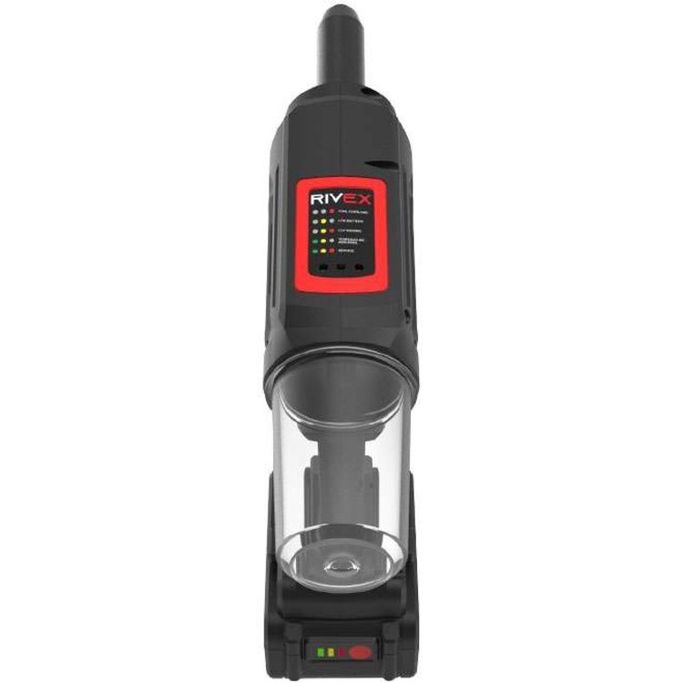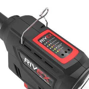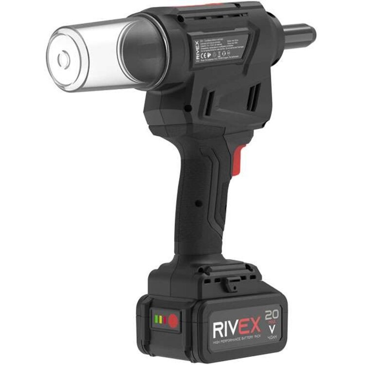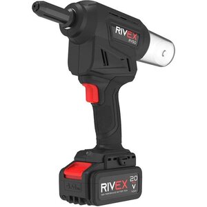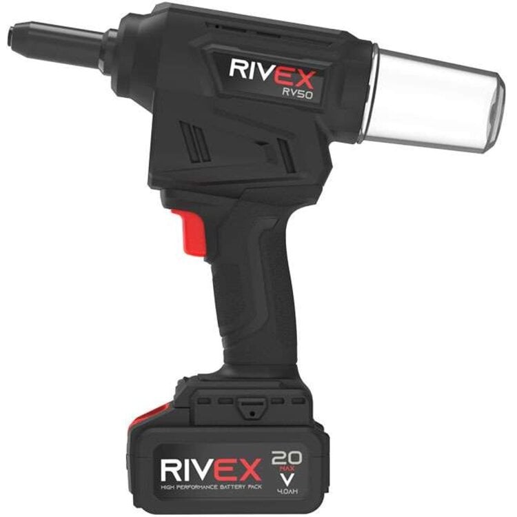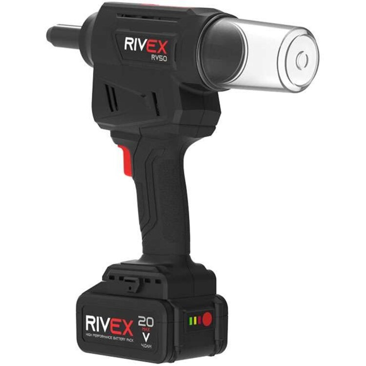 De RIVEX RV50 is een accu blindklinktang die blindklinknagels met een diameter van 2.4; 3.0; 3.2; 4.0; 4.8; 5.0mm van alle materialen kan plaatsen. Het compacte formaat samen met het lichte gewicht maken de machine perfect voor lange productie uren. De ingebouwde LED-verlichting zorgt ervoor dat er altijd voldoende licht op het werkstuk valt. De accu popnageltang is voorzien van een koolborstelloze motor en genereerd een trekkracht van 16kN en een verplaatsing van 25mm. De blindklinktang is uitgerust met een autoreverse-systeem. Dit systeem zorgt ervoor dat de machine na het afbreken van de trekpen direct terugkeert naar de startpositie, wat tijd en energie bespaart. Indien gewenst kan deze functie ook worden uitgeschakeld door de drukknop 10 seconden ingedrukt te houden. Door nogmaals 10 seconden op de drukknop te drukken wordt deze weer geactiveerd. Bovenop de blindklinktang bevinden zich status-LED’s waar de actuele machinestatus kan worden afgelezen. Optioneel zijn neusstukken met een vasthoudmechanisme verkrijgbaar wat voorkomt dat de blindklinknagel niet uit het neusstuk valt wanneer de machine op zijn kop gehouden wordt. Een ander optioneel onderdeel is een neusstuk voor Monobolt Ø 4,8mm structurele blindklinknagels.