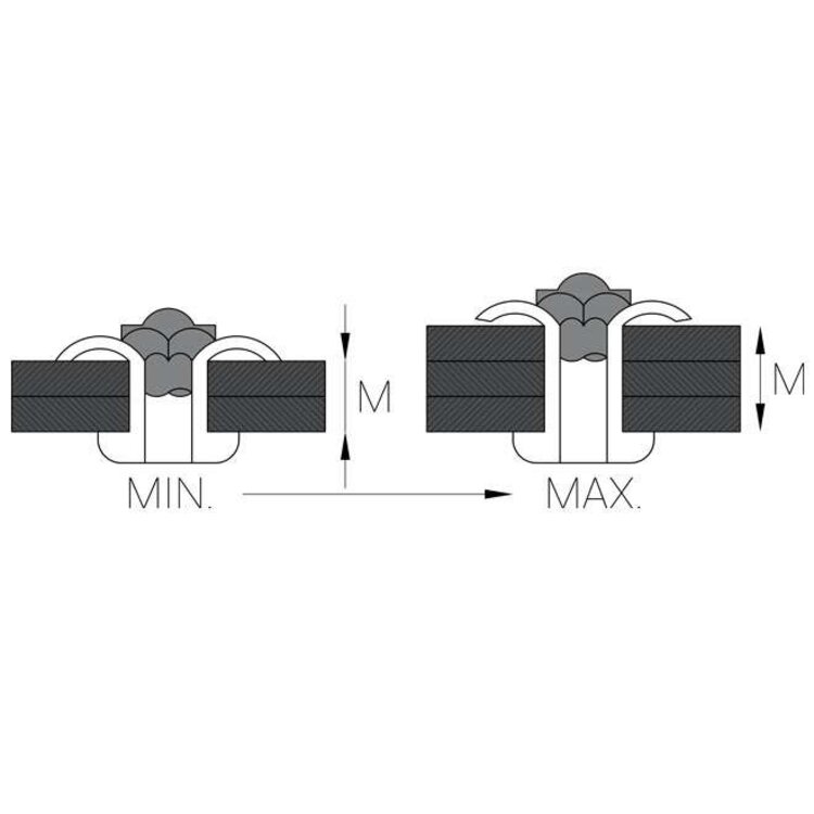 Rozet popnagel 4.8 x 18.0mm met bolkop en een klembereik van 6.0 - 12.0mm. De body is gemaakt van aluminium en de trekpen van staal. Rozet popnagels worden gebruikt om harde materialen op zachte materialen te bevestigen. Bijvoorbeeld; staal op hout, staal op plastic en staal op hardpapier. Een rozet popnagel pelt zichzelf open in vieren, waardoor er een goede drukverspreiding ontstaat aan de achterkant van het materiaal. Blindklinknagels kunnen worden geplaatst met een accu popnageltang, pneumatische popnageltang of een handmatige popnageltang.