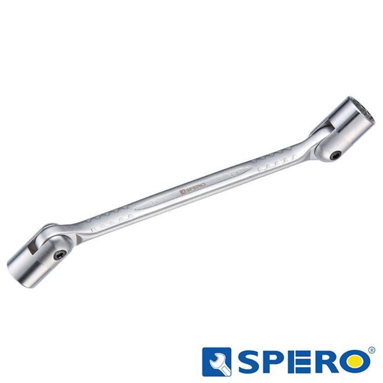 Scharniersleutel met 2 beweegbare doppen aan elke zijde. Ergonomisch vormgegeven (snijdt niet in de hand). Vervaardigd uit HQ Chrome-Molybdenumstaal.