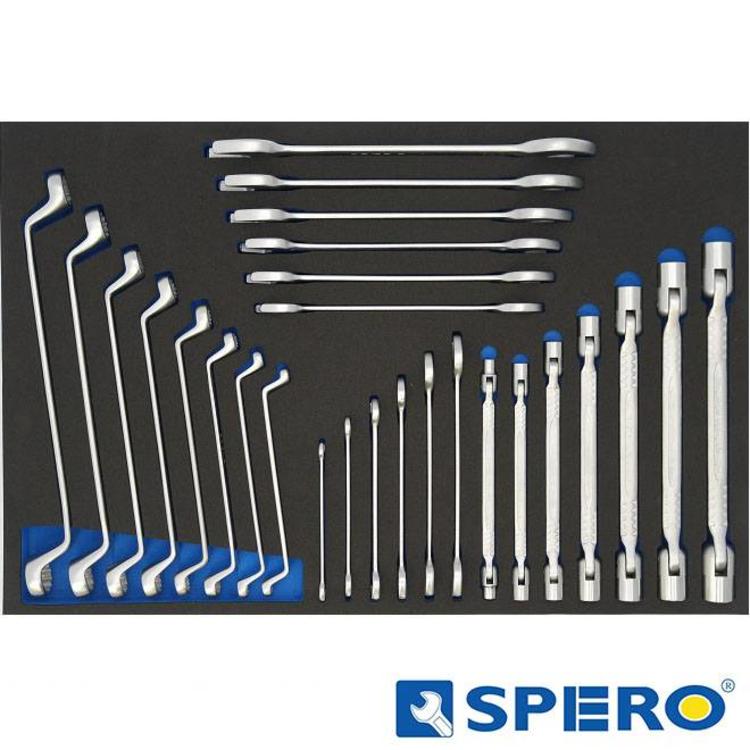 Foam module met een 27 delige sleutelset. De gereedschappen liggen iets ruim in het foam wat uitname eenvoudig maakt. De buitenmaat van de module is 569x397mm.