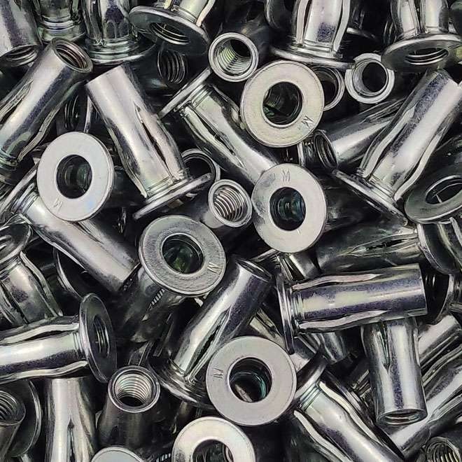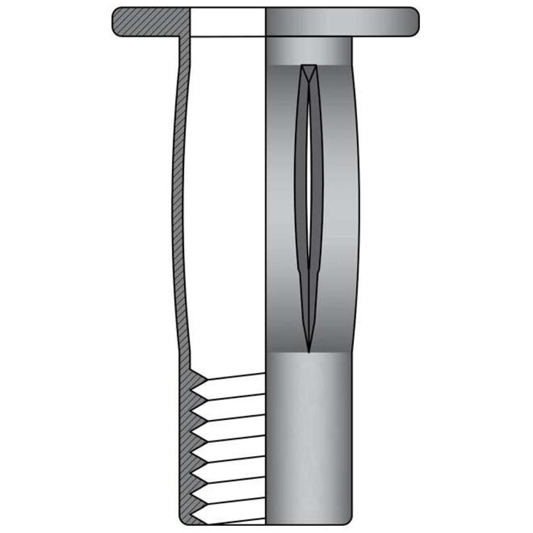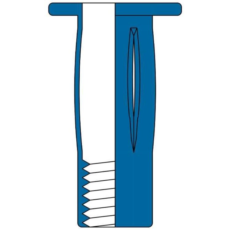 Stalen blindklink spreidmoeren M6 PRE-BULBED met cilindrische kop zijn zeer geschikt voor het aanbrengen van schroefdraad in dunne, zachte en broze materialen. De achterkant van de blindklinkmoer spreid zich open in vieren waardoor een grote spreiding van de krachten ontstaat. Spreidmoeren worden ook veel gebruikt in de bedrijfswageninrichting en camperbouw. Dit type is voorgebold en kan daarom ook met machines welke door de spreidmoer heenschroeven worden geplaatst. Let op! Dit type blindklinkmoeren kunnen alleen met speciale gereedschappen worden aangebracht, omdat er een langere slag nodig is om de blindklinkmoeren te klemmen. Bij het selecteren van de juiste blindklinkmoer moet de plaatdikte of wandikte worden opgemeten van het werkstuk. De gemeten dikte moet binnen het klembereik vallen van de blindklinkmoer.