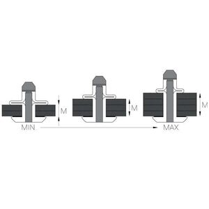 Structurele spreidnagel 6.4 x 26.5mm met bolkop en O-ring en een klembereik van 6.4 - 12.7mm. De body en trekpen zijn gemaakt van aluminium. Structurele spreid popnagels worden gebruikt om bijvoorbeeld plaatmaterialen aan elkaar te verbinden. Achter het materiaal wordt een ‘’paraplu’’ gezet voor een goede drukverspreiding. Bij gebruik in combinatie met de neopreen O-ring ontstaat er een waterdichte verbinding. De trekpen blijft mechanisch geborgd in de body. LET OP! bij plaatsing van structurele spreid popnagels van het type M is een speciaal neusstuk nodig. Blindklinknagels kunnen worden geplaatst met een accu popnageltang, pneumatische popnageltang of een handmatige popnageltang.