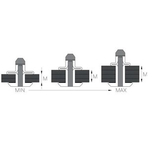 Structurele spreidnagel 6.4 x 29.7mm met bolkop en O-ring en een klembereik van 9.5 - 15.9mm. De body en trekpen zijn gemaakt van aluminium. Structurele spreid popnagels worden gebruikt om bijvoorbeeld plaatmaterialen aan elkaar te verbinden. Achter het materiaal wordt een ‘’paraplu’’ gezet voor een goede drukverspreiding. Bij gebruik in combinatie met de neopreen O-ring ontstaat er een waterdichte verbinding. De trekpen blijft mechanisch geborgd in de body. LET OP! bij plaatsing van structurele spreid popnagels van het type M is een speciaal neusstuk nodig. Blindklinknagels kunnen worden geplaatst met een accu popnageltang, pneumatische popnageltang of een handmatige popnageltang.
