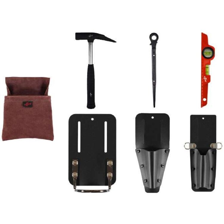Complete set voor de steigerbouwer, compleet met spietas, hamerhouder, steigerbouwhamer 600gram, ratelhouder, werfpuntratel 19/22mm, waterpashouder en torpedo waterpas 250mm.