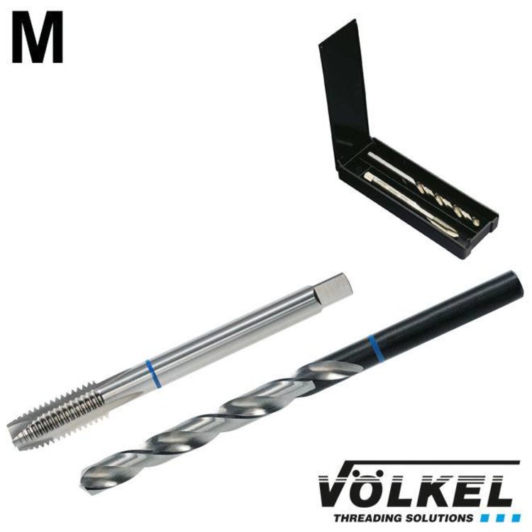 Twinbox met kleurring-machinetap en spiraalboor voor algemeen gebruik in slijtvast staal tot 1200 N/mm², hooggelegeerd staal, taaie kortspanende materialen, kortspanig roestvrijstaal en gelegeerd gereedschapsstaal. Geschikt voor doorlopende gaten en machinaal gebruik. De vorm van de tap zorgt ervoor dat de spanen naar beneden de tap uitgedreven worden.